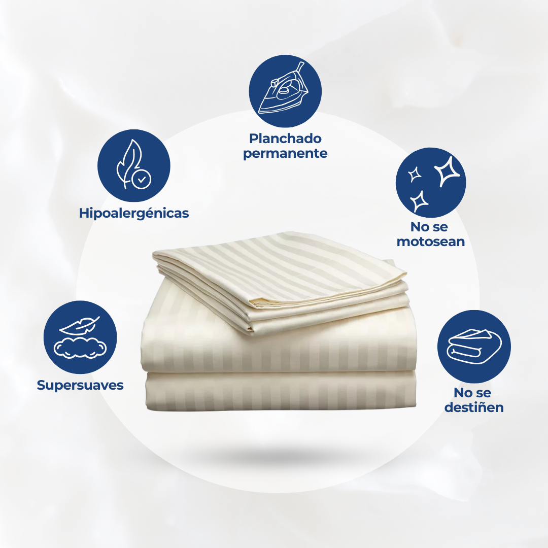 Duerme mejor desde la primera noche con nuestras elegantes sábanas beige de microfibra premium: no destiñen, anti‑motas, efecto planchado permanente y textura supersuave.