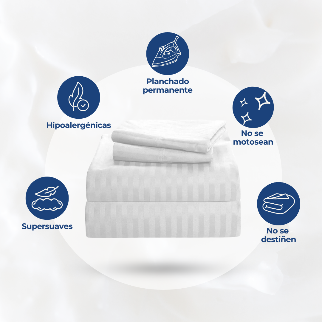 Duerme mejor desde la primera noche con nuestras elegantes sábanas blancas de microfibra premium: no destiñen, anti‑motas, efecto planchado permanente y textura supersuave.