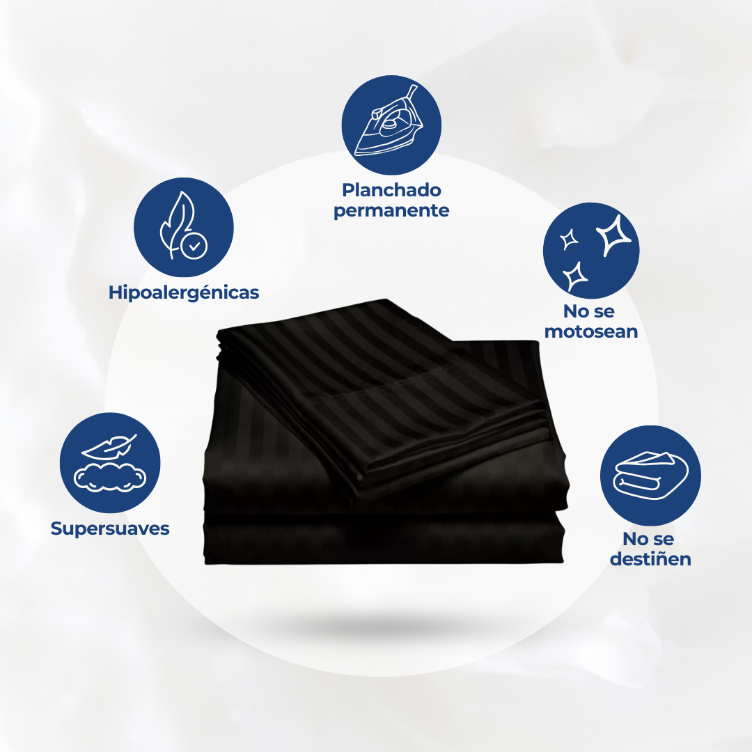 Duerme mejor desde la primera noche con nuestras elegantes sábanas negras de microfibra premium: no destiñen, anti‑motas, efecto planchado permanente y textura supersuave.